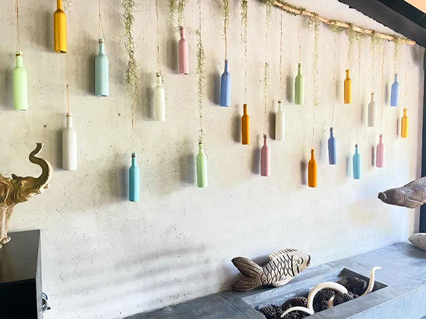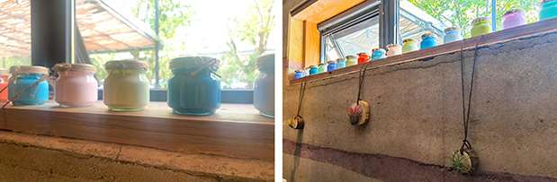 于森林里,“愛”藝術家們將原本要“廢棄”的瓶瓶罐罐重新利用,通過色彩手藝,
