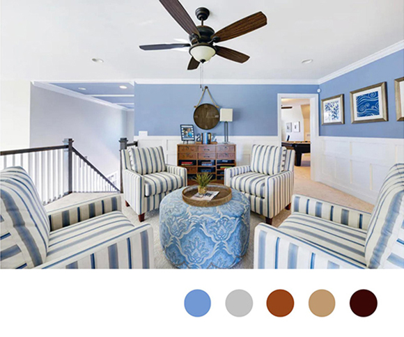 大眾的認(rèn)知中 ,藍(lán)色同樣是一種會令人安心的顏色。在家居搭配中,我們