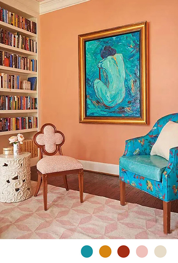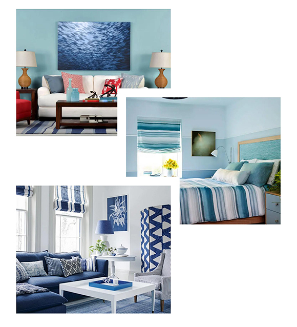 藍(lán)色的家居環(huán)境中,擺放綠色的植物、靠墊或者壁畫 ,為家居空間注入清