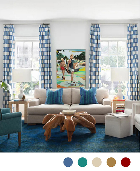色的墻面、窗簾、沙發(fā)等,與碧藍(lán)色的地毯、抱枕等小飾品相互襯托,讓