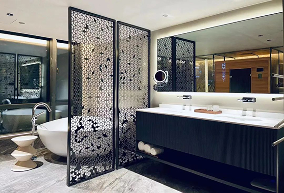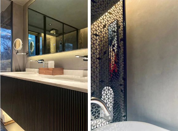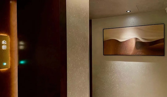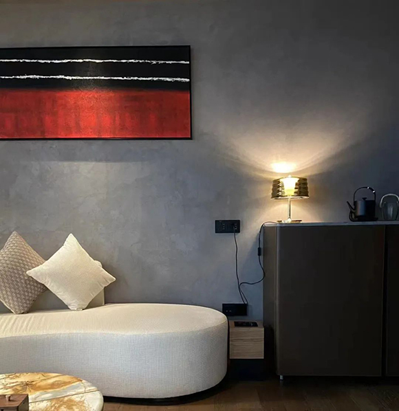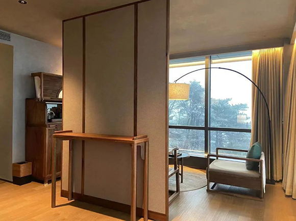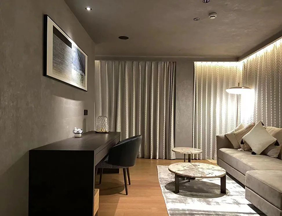 客房?jī)?nèi)家具多采用天然巖板與北美胡桃木,墻面是愛(ài)涂妝納帕皮彩系列