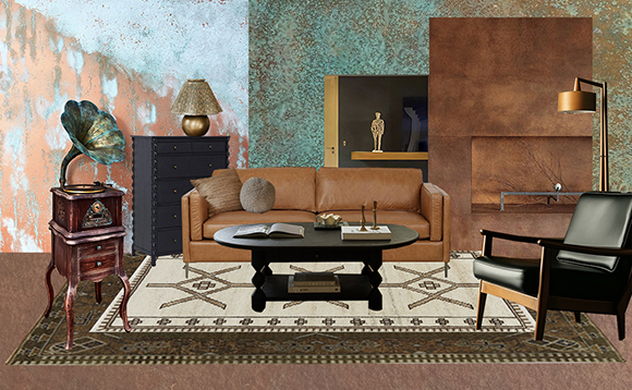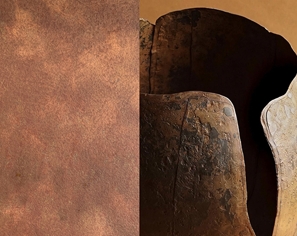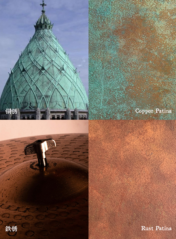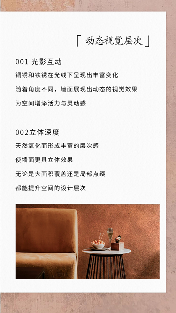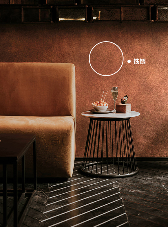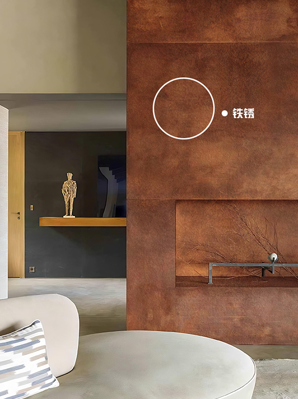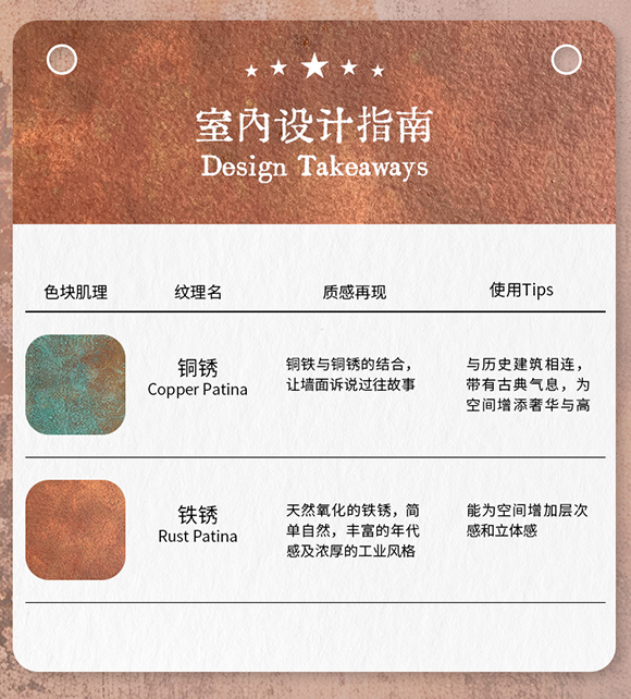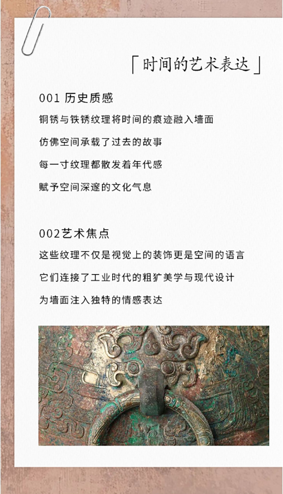 銅銹與鐵銹紋理將時間的痕跡融入墻面